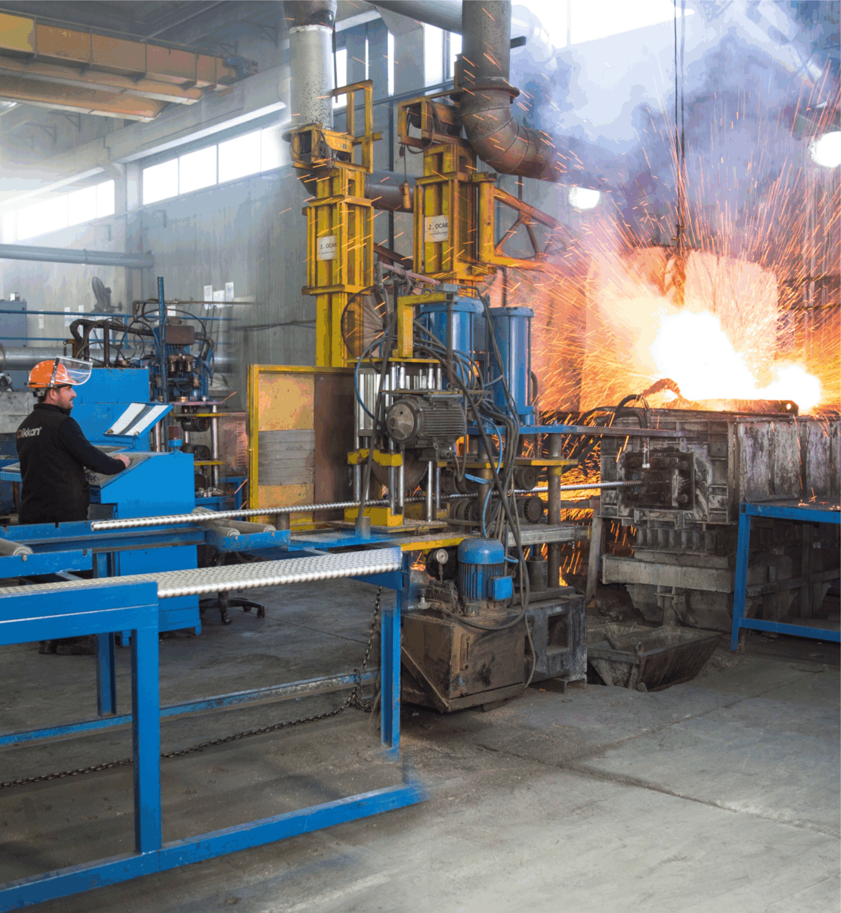 Sürekli döküm bronz, sabit kalıp sürekli döküm makinelerinde üretilir ve eritme, bir üretim çalışması boyunca sürekli olarak devam eder. Sürekli döküm teknolojisinin kullanılması, standart ölçülerde veya müşteri talebine göre boruların, çubukların, karelerin veya lamaların üretilmesine olanak sağlar. İz-Metal’in sürekli bronz döküm hattının kapasitesi aylık 100 tondur. Pürüzsüz yüzeyler ve homojen form, dikkatle incelenmiş fiziksel ve kimyasal analizlerle sağlanır. Sürekli döküm ürünlerde doğrultma işlemi yapılmaktadır. Avrupa normlarına da uygun olacak şekilde garanti edebileceğimiz doğrusallık 1 mm/M’dir.